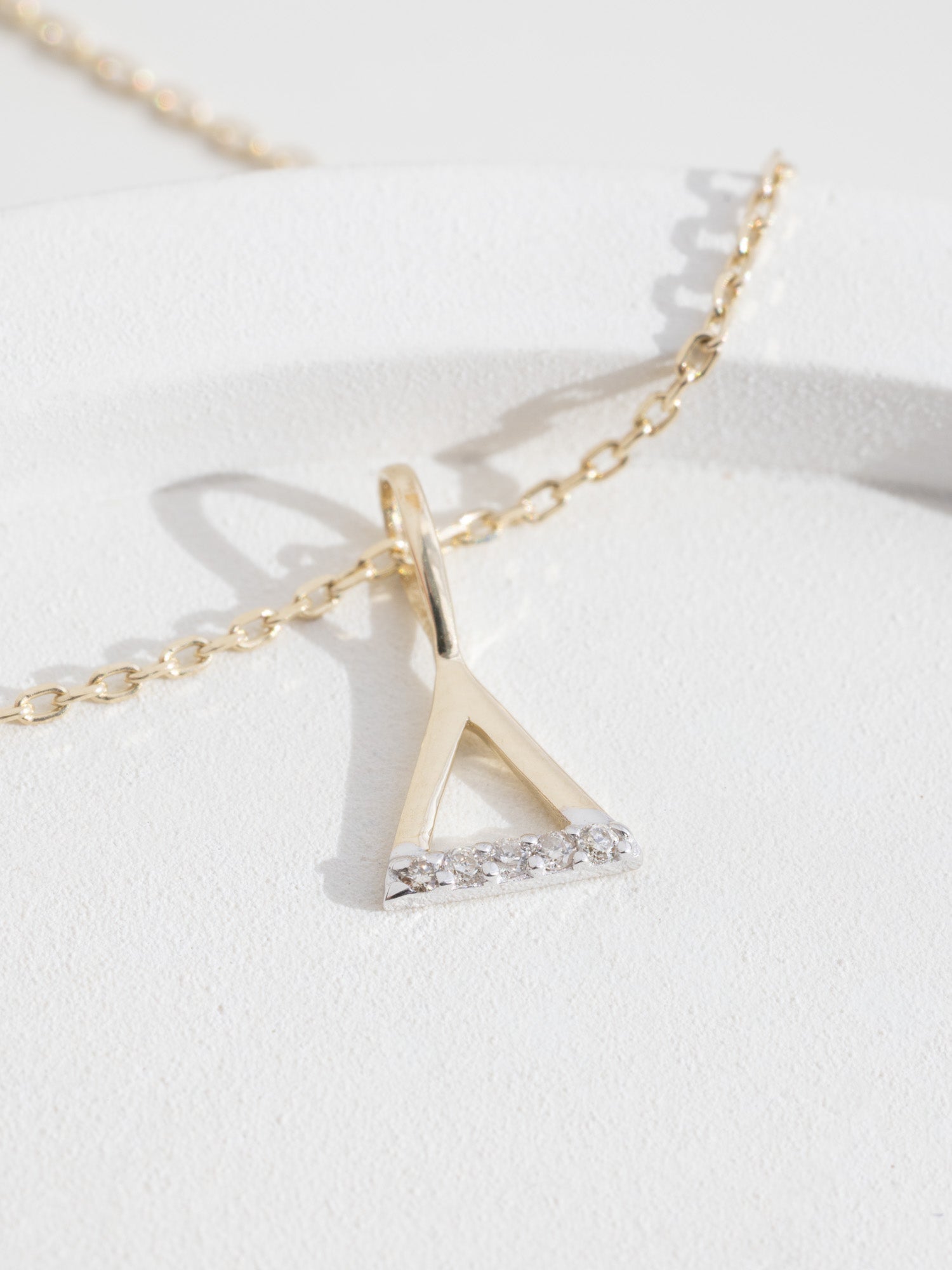 The necklace, meticulously crafted from solid gold, encapsulates this ardor with its unique flame-inspired triangle design, pointing upwards, further accentuated by a line of shimmering white diamonds. It serves as a constant reminder of the fire bearer's passion and spirit.