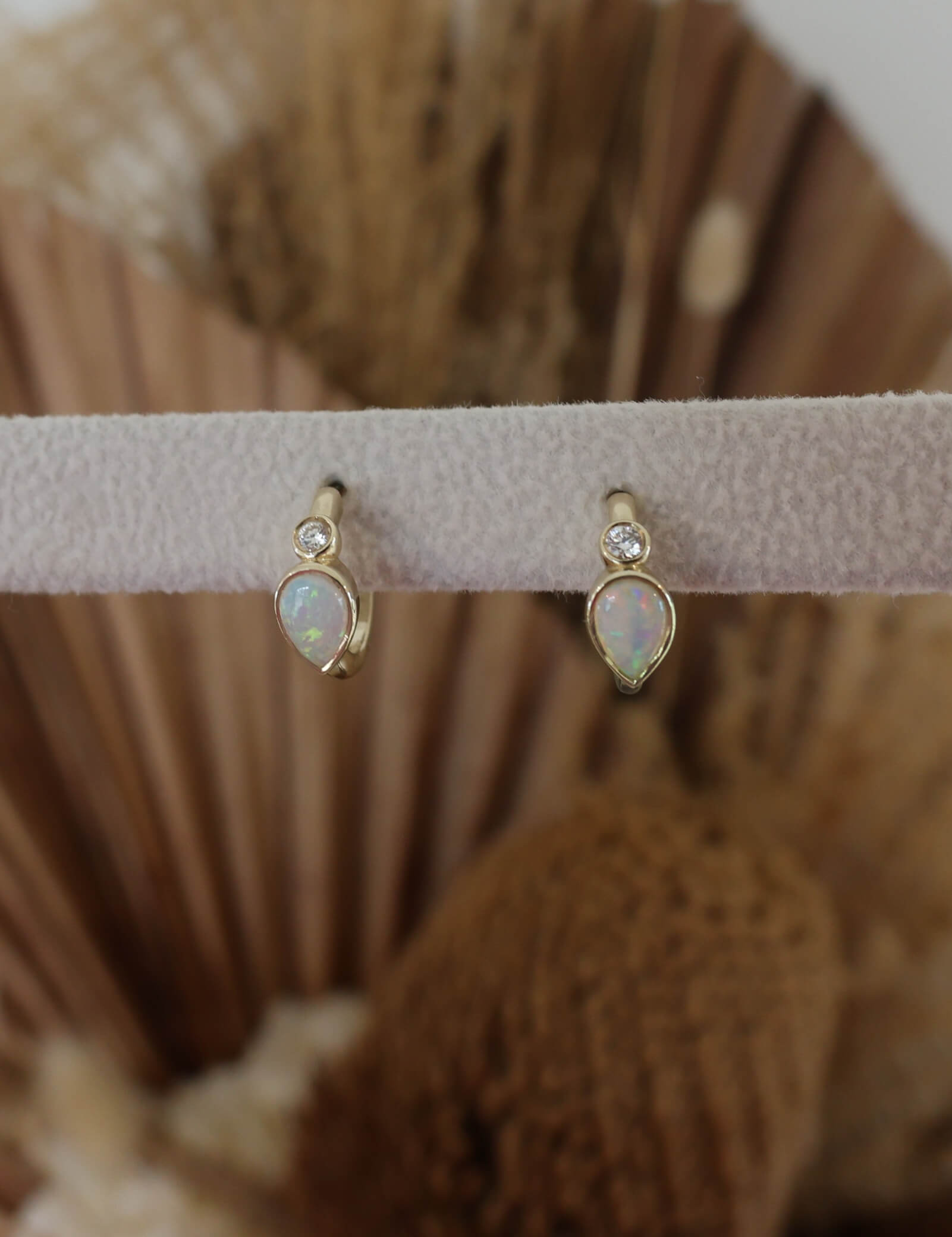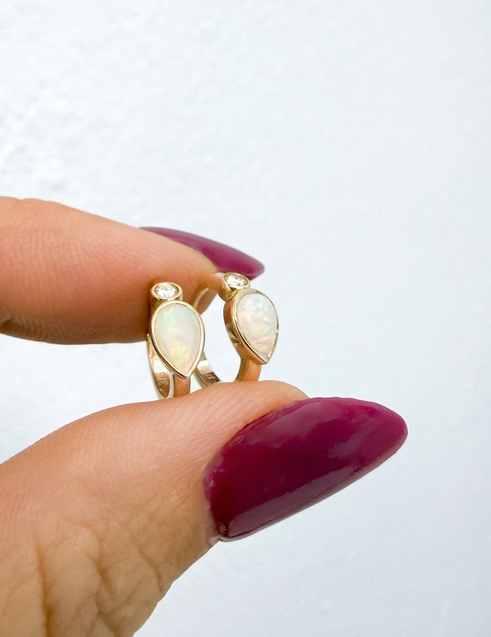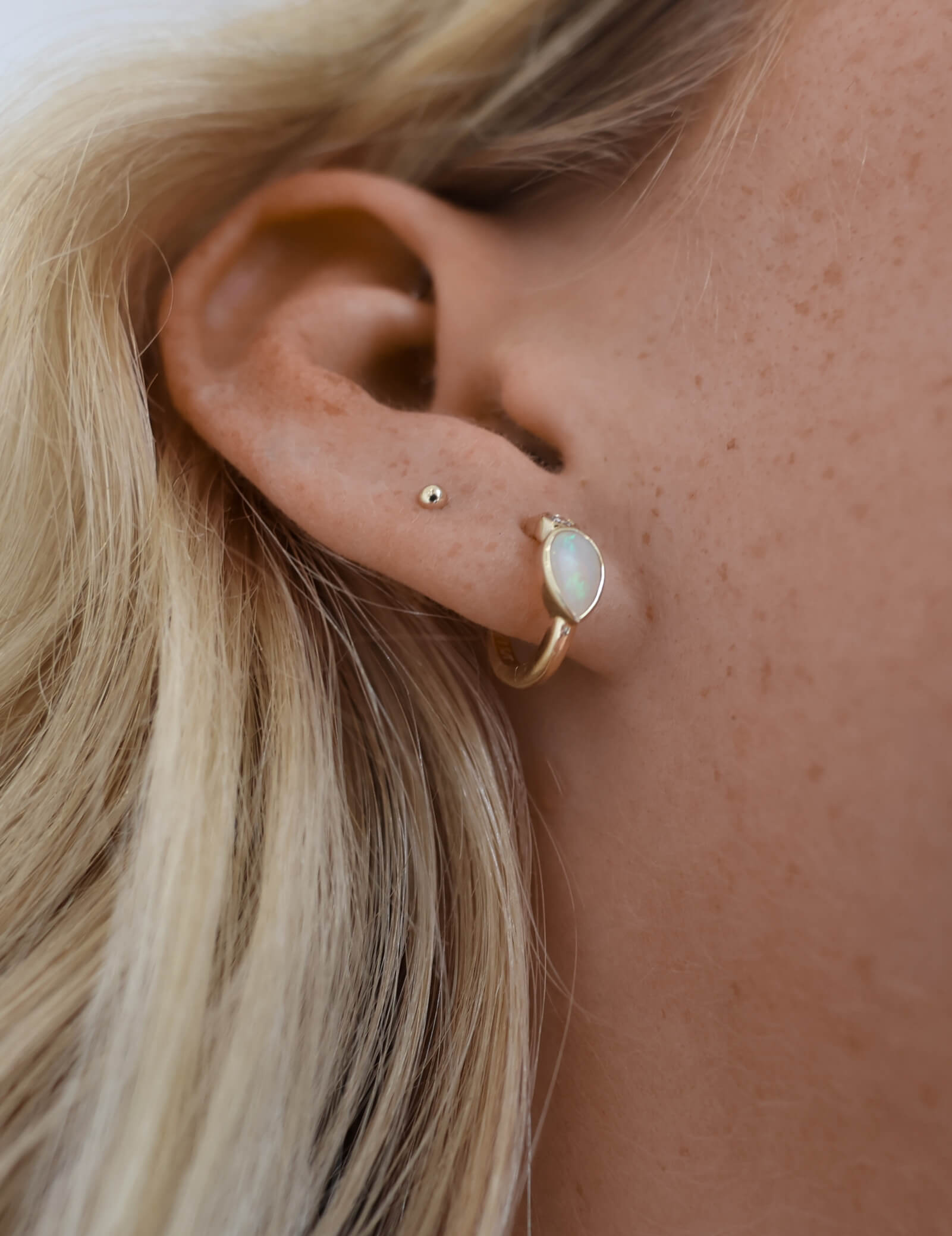 The Higher Love Earrings has a gold weight between .85 grams. The Australian Opal is 6.5mm x 4.4mm in size. It also features a .030 carat diamond. The earrings have an internal diameter of 9mm and 12mm external diameter.