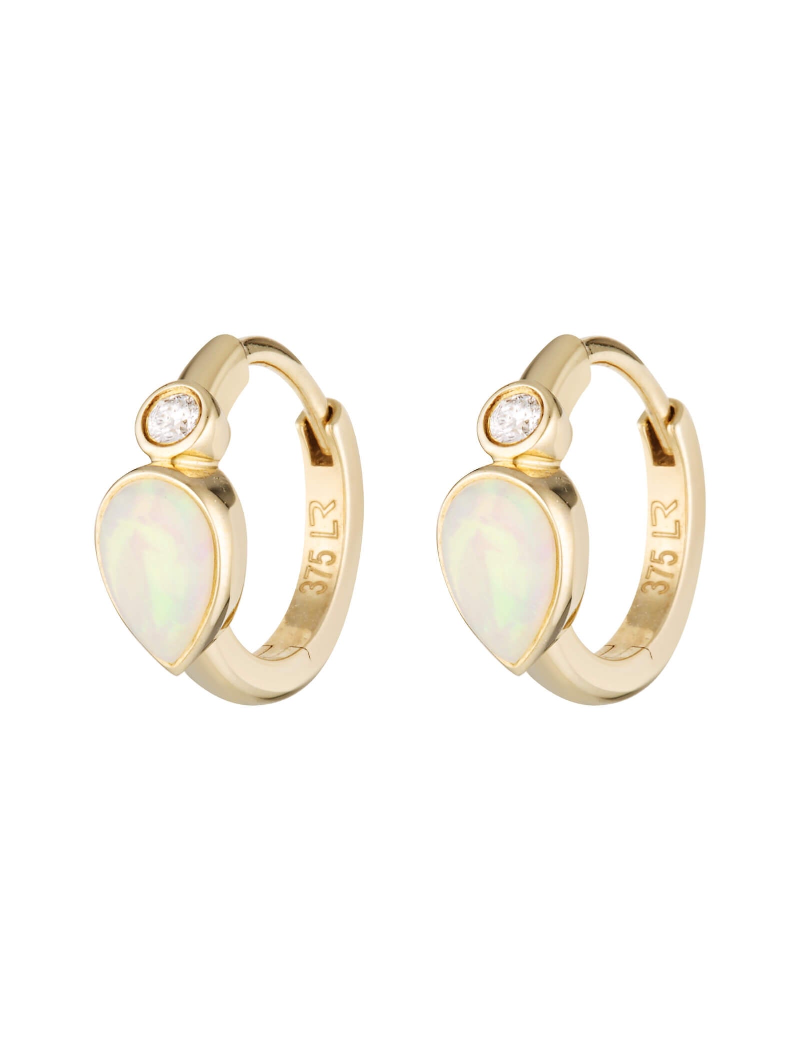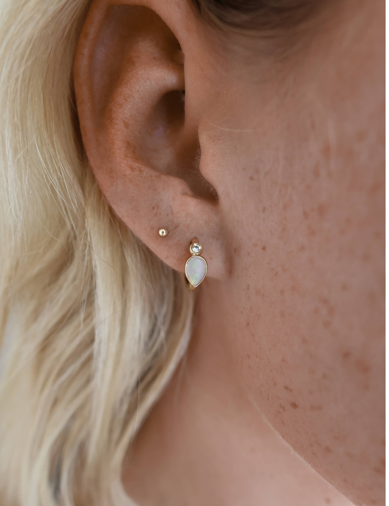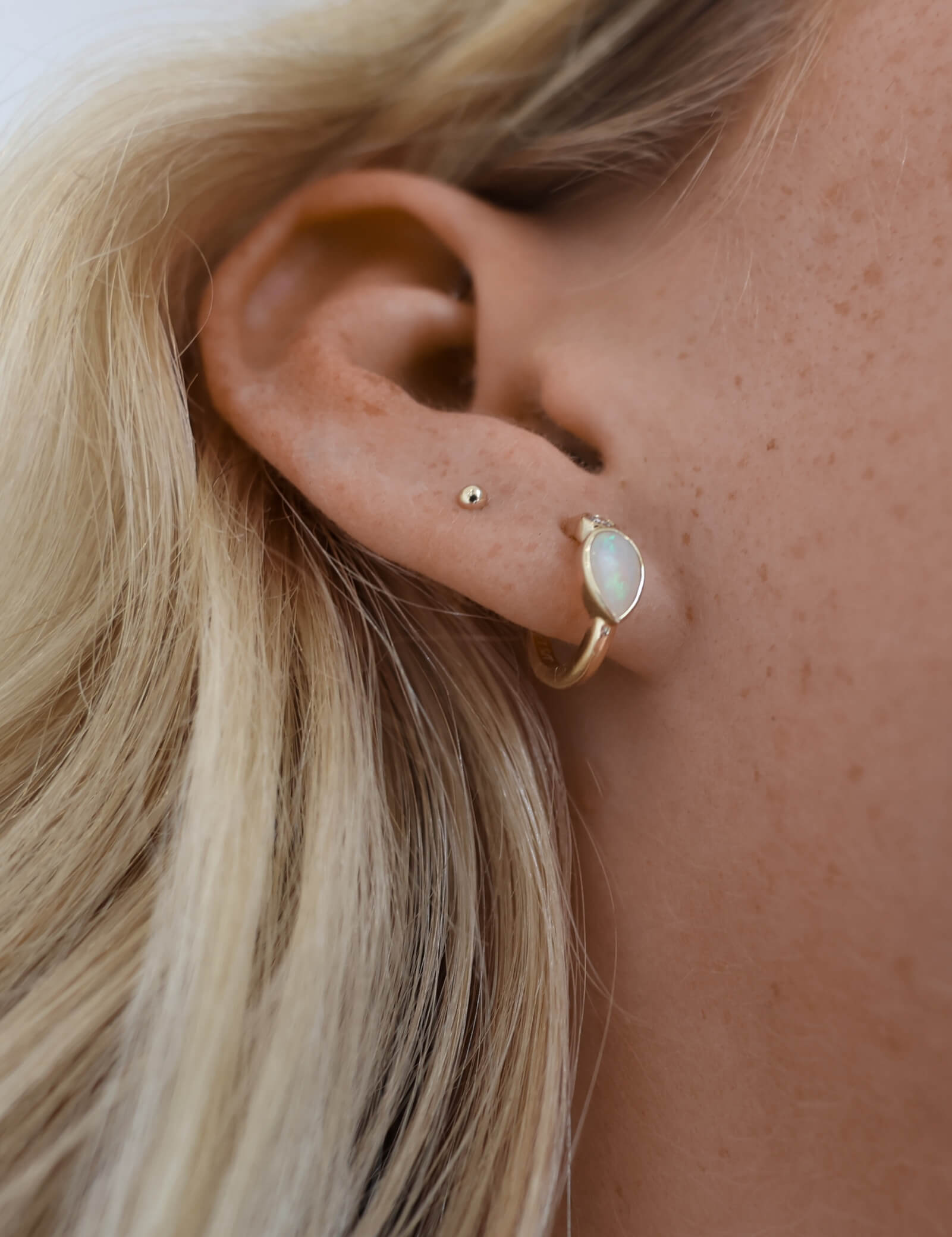 The Higher Love Earrings has a gold weight between .85 grams. The Australian Opal is 6.5mm x 4.4mm in size. It also features a .030 carat diamond. The earrings have an internal diameter of 9mm and 12mm external diameter.