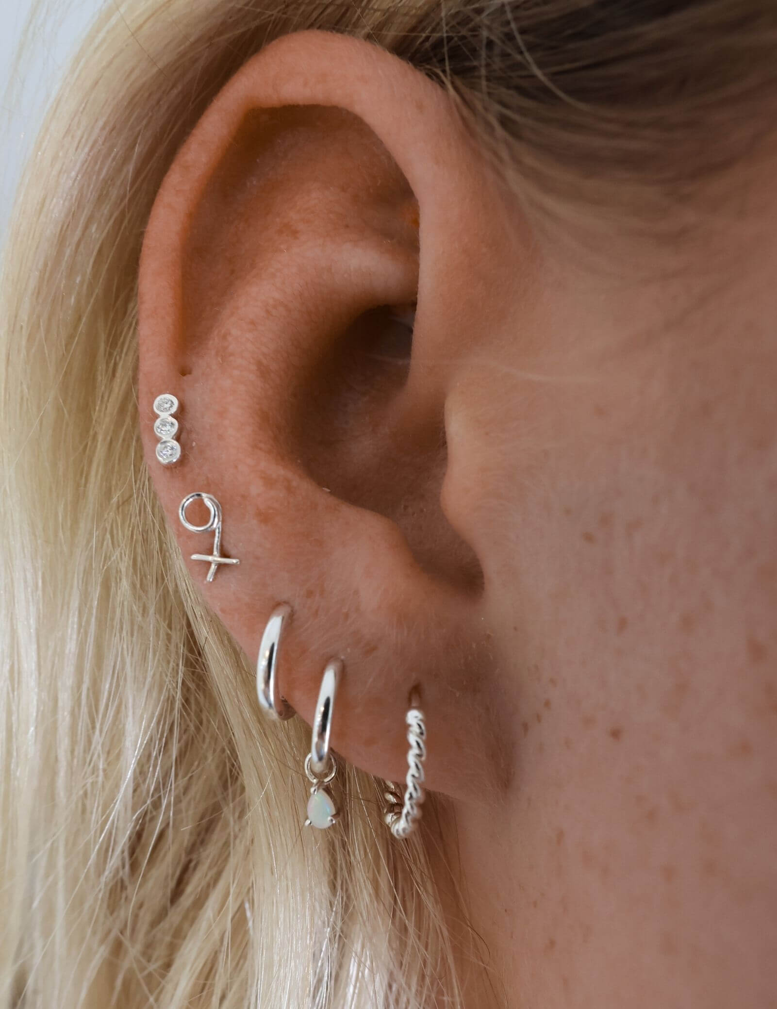 Twist these so they run slightly twisted up the earlobe, this makes them look like multiple little piercings climbing up the lobe.