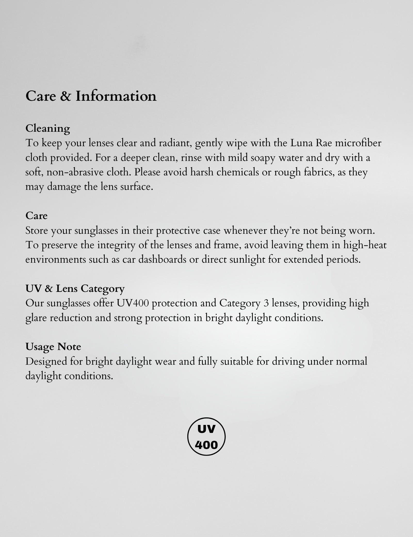 Our Luna Rae frames are made for repeat wear — thoughtfully designed, beautifully balanced, and effortless from every angle. The sort of piece you reach for on the way out the door and keep on long after the sun dips.
