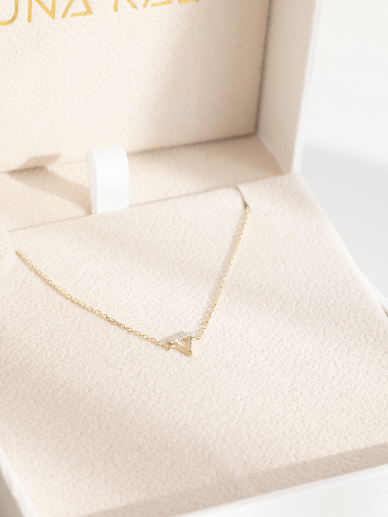 The bracelet has a gold weight of .49 grams, with the triangle measuring 5.6mm on each side, providing a balance of delicacy and substance.