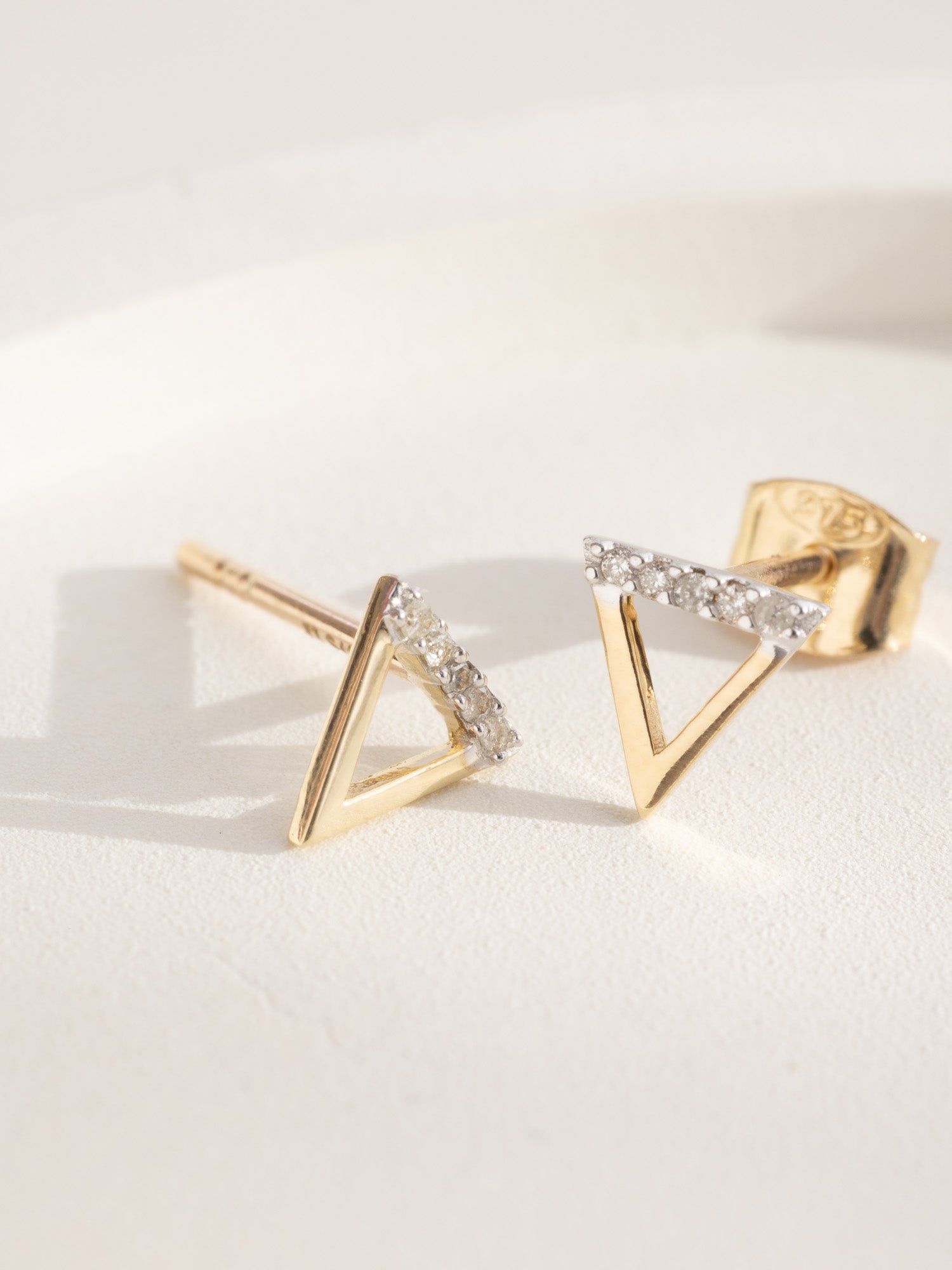 Each Water Element Stud is crafted from solid 9k gold, weighing 1.08 grams per stud. The sides of the triangle measure 5mm in length. The studs feature five .8mm brilliant-cut white diamonds, perfectly combining delicacy and substance.