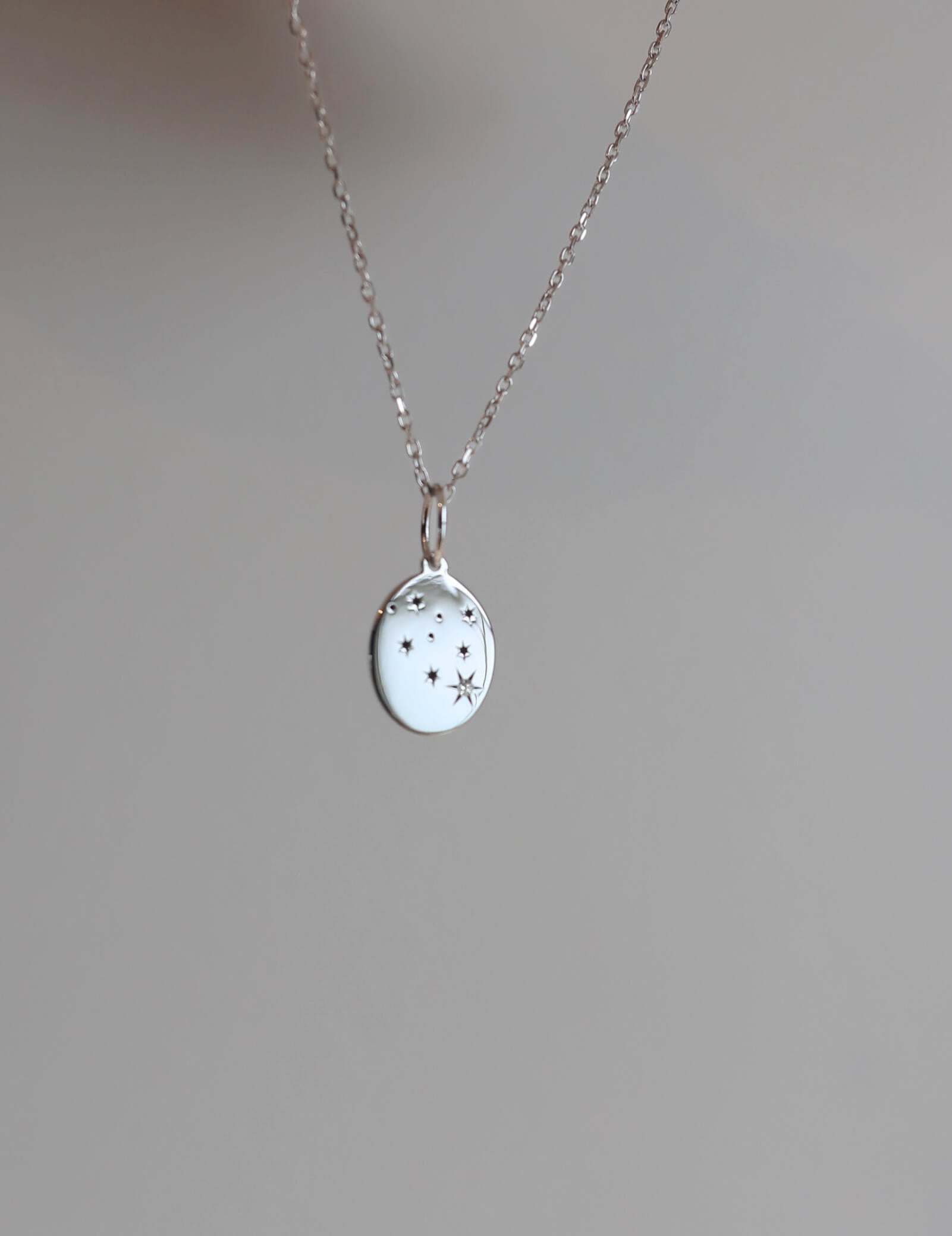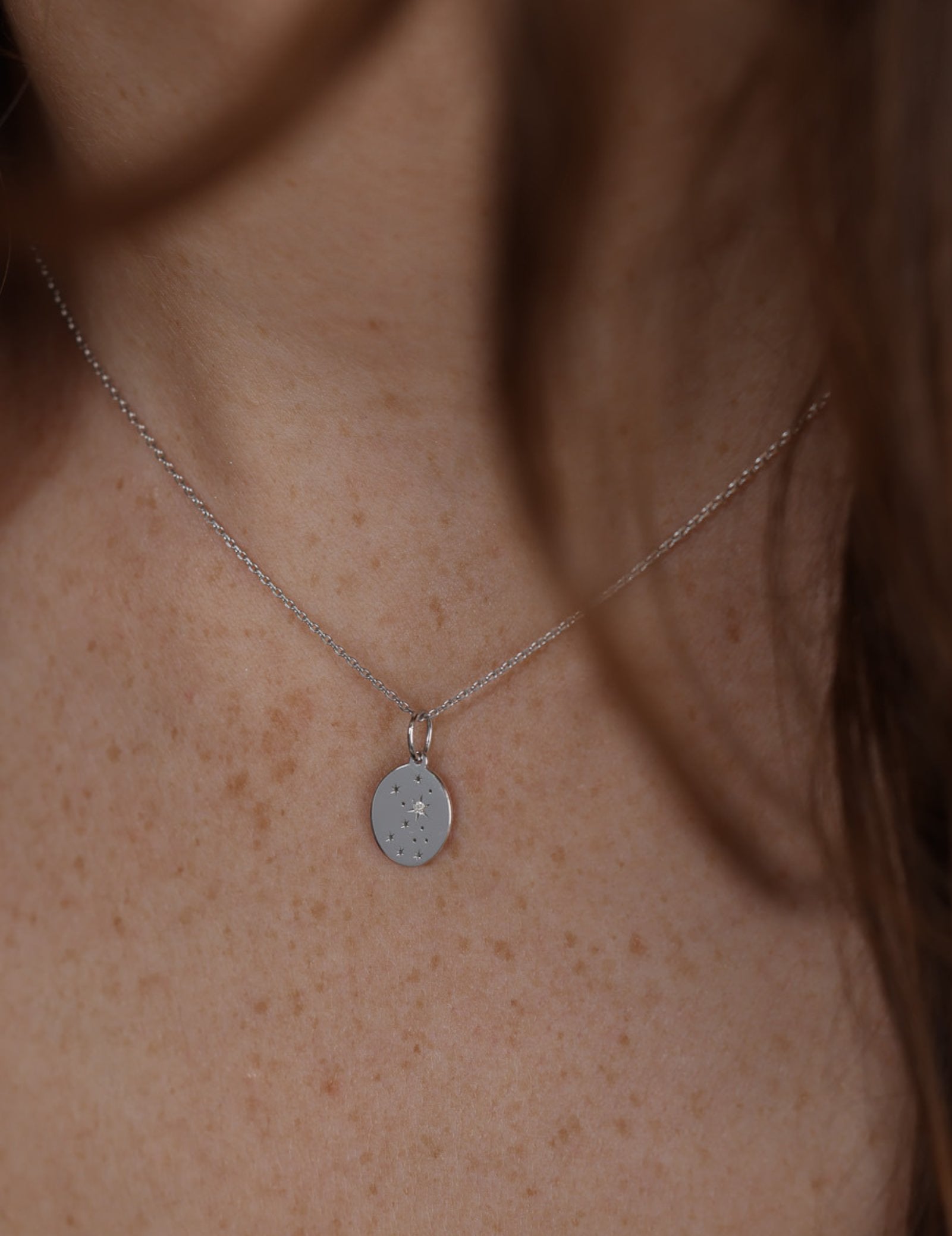 The pendant depicts the constellation pattern, fashioned from solid 9K white gold with a single white diamond marking the Porrima star. Available with a 40 - 45 cm necklace with 5 cm extension, this necklace is versatile, significant, and personalized to your astrological sign.